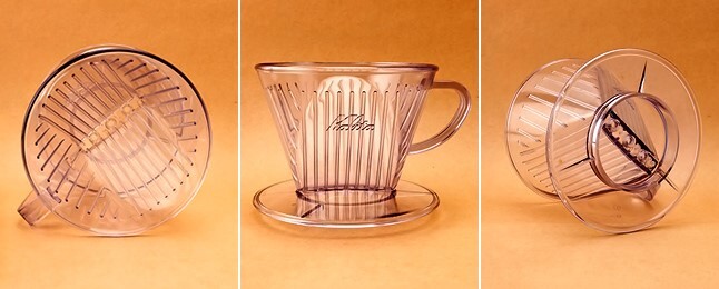 바구니 모양의 칼리타 드리퍼, 전체적으로 리브가 있고 바닥에는 3개의 작은 추출구가 있다